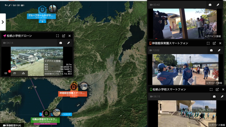 ドローンやスマホで撮影した複数地点の映像を、地図上に集約して共有