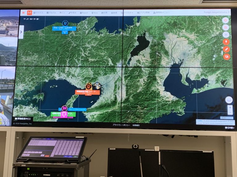 T&Tは南あわじ市にて2台のドローンを飛行させ、また、香美町ではスマートフォンから映像を撮影。震災時には県庁や被災市町の災害対策本部から複数地点の映像をリアルタイムに見ることを想定し、合わせてデモ検証を行った。これら複数地点の映像をリアルタイムで共有するためには、リアルグローブ社(https://realglobe.jp/)の「Hec-Eye(ヘックアイ)」というシステムを利用。ドローン等からの取得情報を地図上に集約し、共有することが出来る大変便利なプラットフォームとなっている。