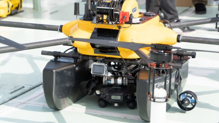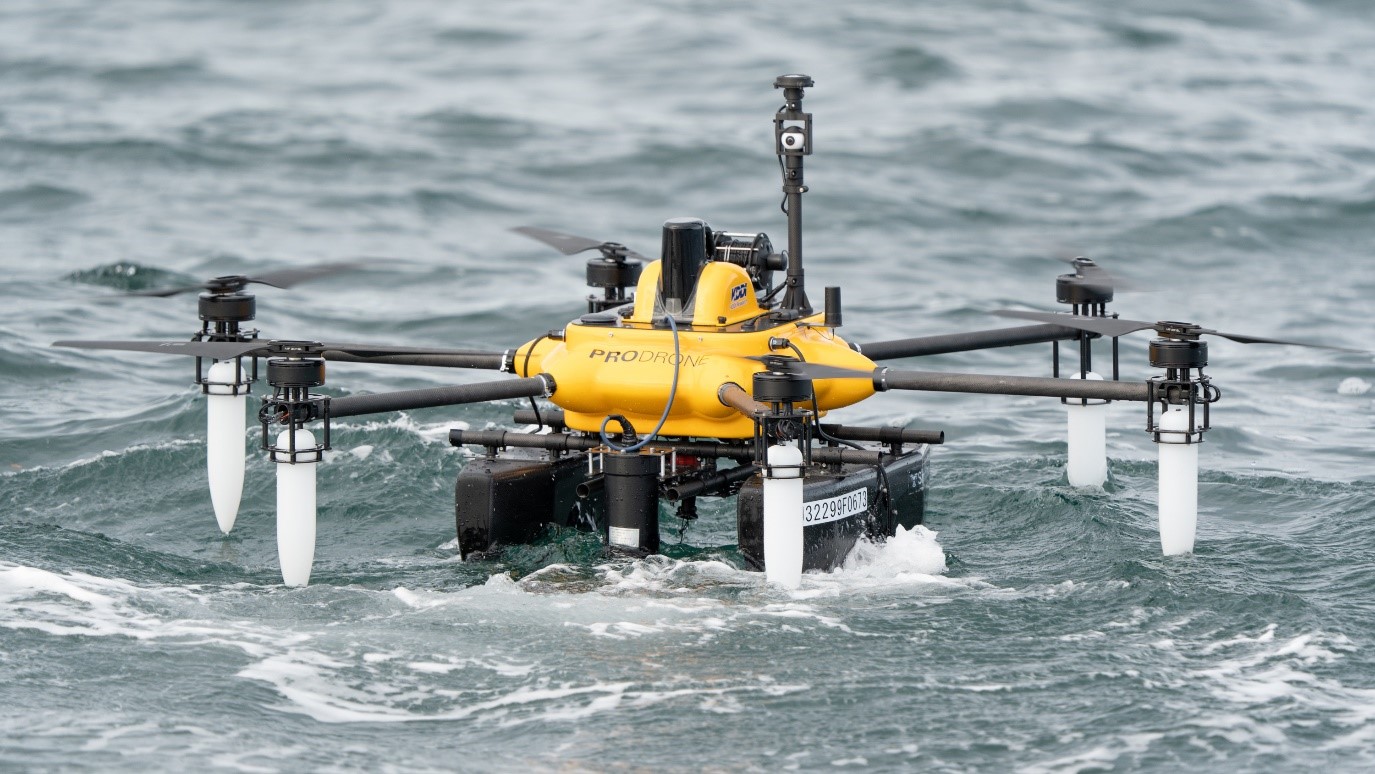 また今回の実証実験は、遠隔でのドローン運航を前提としています。空中ドローンの着水後にドローン周囲に船が近づいてきたり、突然潮目が変わり流されてしまって、ブイにぶつかってしまったりする場合を考慮して、対象物を避ける為に360度カメラを搭載しました。遠隔で周囲を監視しながら点検作業ができるような機能も追加しました。