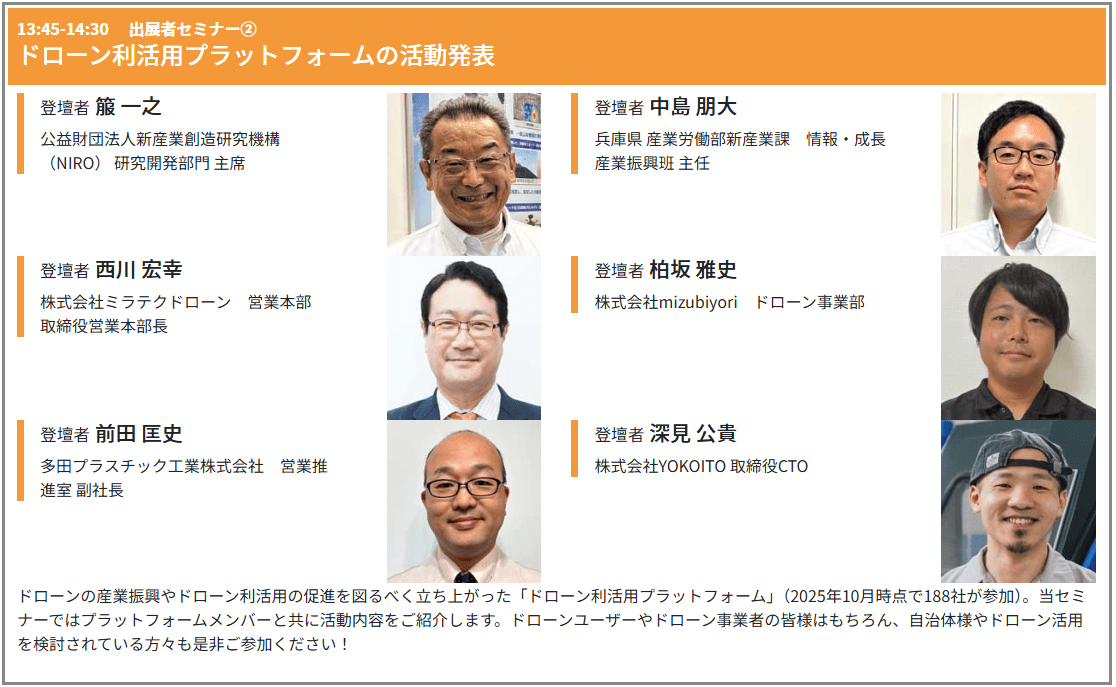 出展者セミナーでは「ドローン利活用プラットフォームの活動発表」も行います。ぜひ、ご来場下さい!
